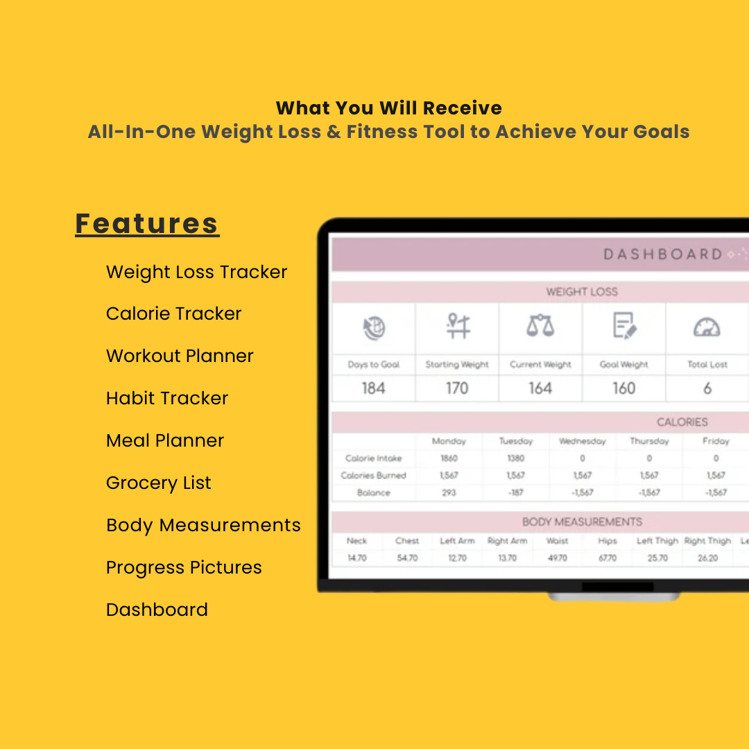 🏋🏻 हमारे वेट लॉस और फिटनेस ट्रैकर के साथ अपनी फिटनेस यात्रा को बदलें। इस ऑल-इन-वन टूलकिट में कैलोरी ट्रैकर, मील प्लानर, हैबिट ट्रैकर और वर्कआउट प्लानर शामिल हैं, जो Google शीट में पूरी तरह से संपादन योग्य और उपयोग में आसान हैं। चाहे आप कैलोरी गिन रहे हों, भोजन की योजना बना रहे हों, आदतों पर नज़र रख रहे हों या वर्कआउट का आयोजन कर रहे हों, हमारा डिजिटल प्लानर आपकी मदद करता है। तुरंत डाउनलोड करें और आज ही प्रगति करना शुरू करें!