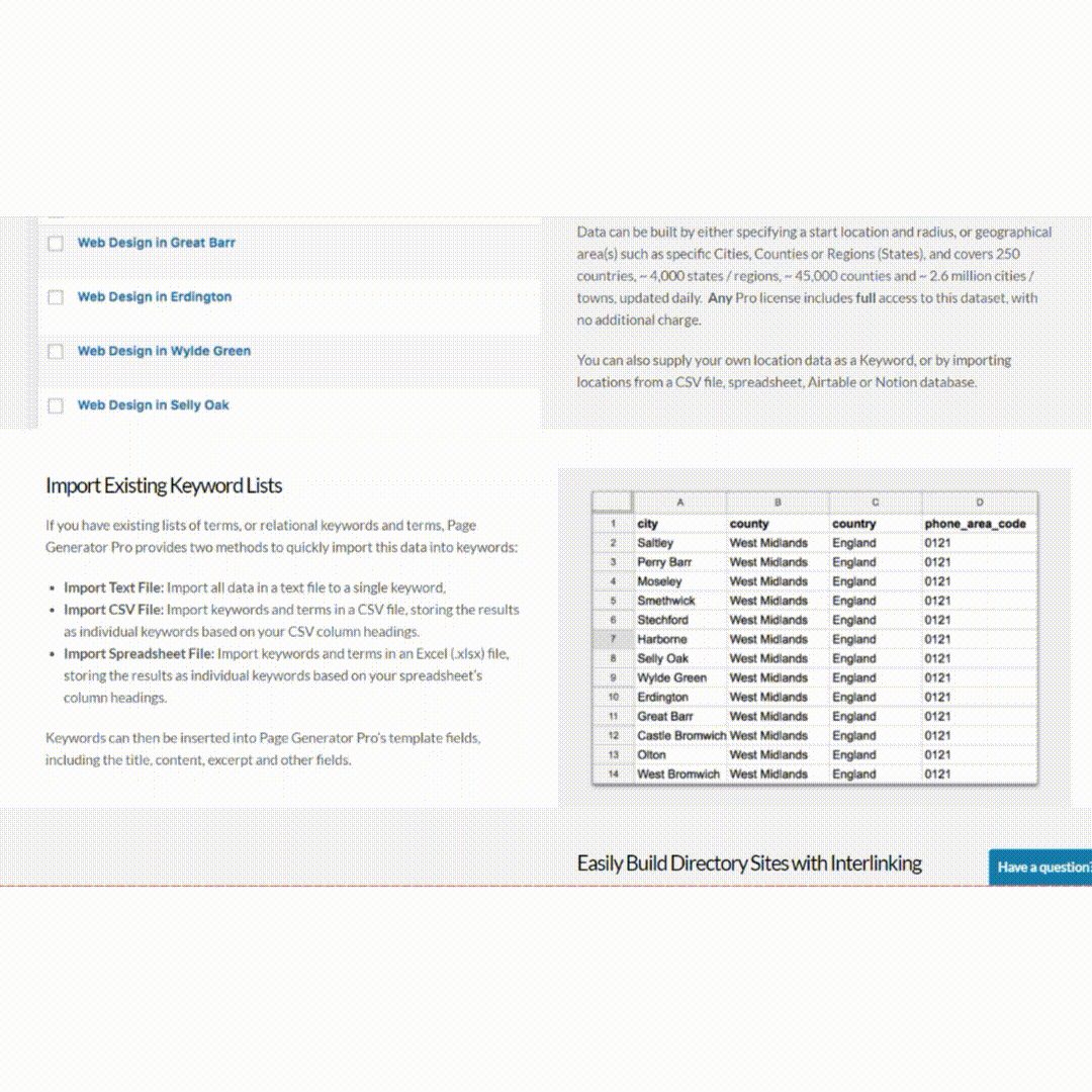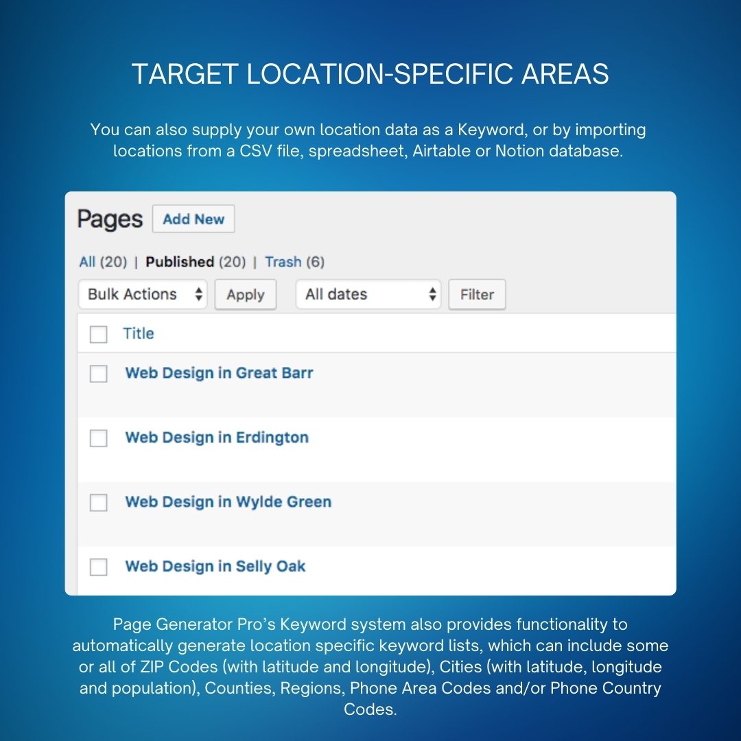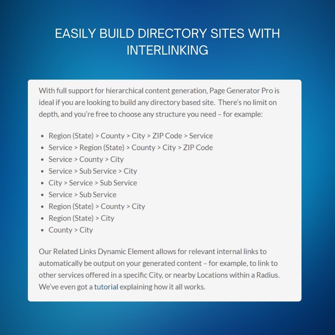 நகரம் அல்லது இருப்பிடம் சார்ந்த பக்கங்களை உருவாக்குவதற்கும், தயாரிப்புகள் அல்லது சேவைகளின் கோப்பகங்களை உருவாக்குவதற்கும் அல்லது புதிய வலைப்பதிவு உள்ளடக்கத்தை வாரங்களுக்கு திட்டமிடுவதற்கும் ஏற்றது. பேஜ் ஜெனரேட்டர் ப்ரோ அனைத்தையும் கையாளக்கூடிய சக்திவாய்ந்த அம்சங்களை வழங்குகிறது, மேலும் பல.