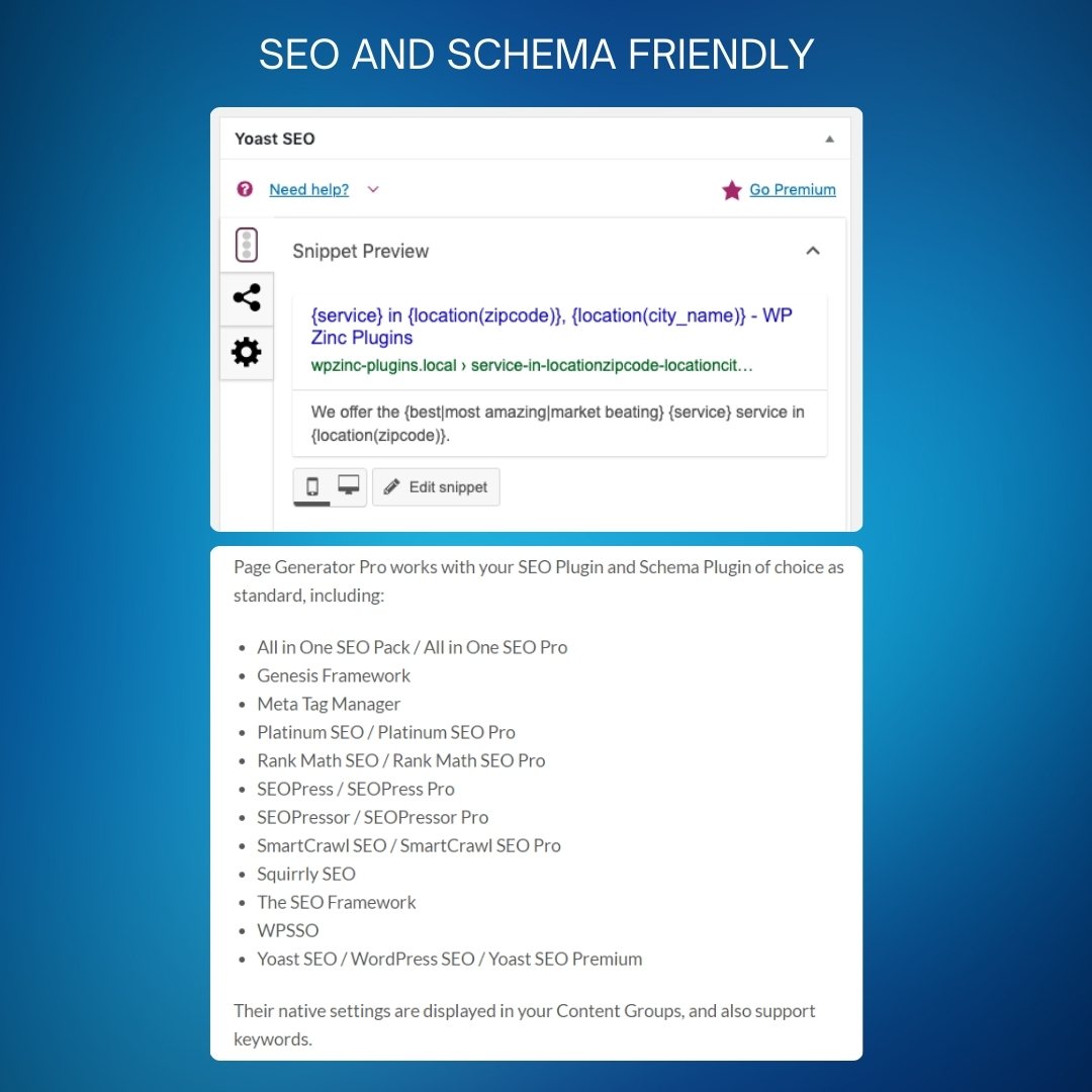 பேஜ் ஜெனரேட்டர் ப்ரோ, ஆல் இன் ஒன் எஸ்சிஓ பேக், யோஸ்ட், ரேங்க் மேத், ஜெனிசிஸ் ஃப்ரேம்வொர்க், பிளாட்டினம் எஸ்சிஓ, எஸ்சிஓபிரெஸ், ஸ்மார்ட் க்ரால், ஸ்குவிர்லி, தி எஸ்சிஓ ஃபிரேம்வொர்க், டபிள்யூபிஎஸ்எஸ்ஓ மற்றும் எஸ்சிஓபிரெஸர் உள்ளிட்ட சிறந்த எஸ்சிஓ செருகுநிரல்களுடன் ஒருங்கிணைக்கிறது. இது முக்கிய வார்த்தைகளை ஆதரிக்கிறது, பக்க குழுக்களுக்கு இடையில் இணைக்க அனுமதிக்கிறது, மேலும் பல்வேறு ஆதாரங்களில் இருந்து படங்கள் சிறந்த Google படத் தேடல் தரவரிசையில் அவற்றின் EXIF கோப்புகளில் புவிஇருப்பிடம் தரவை சேர்க்க அனுமதிக்கிறது.